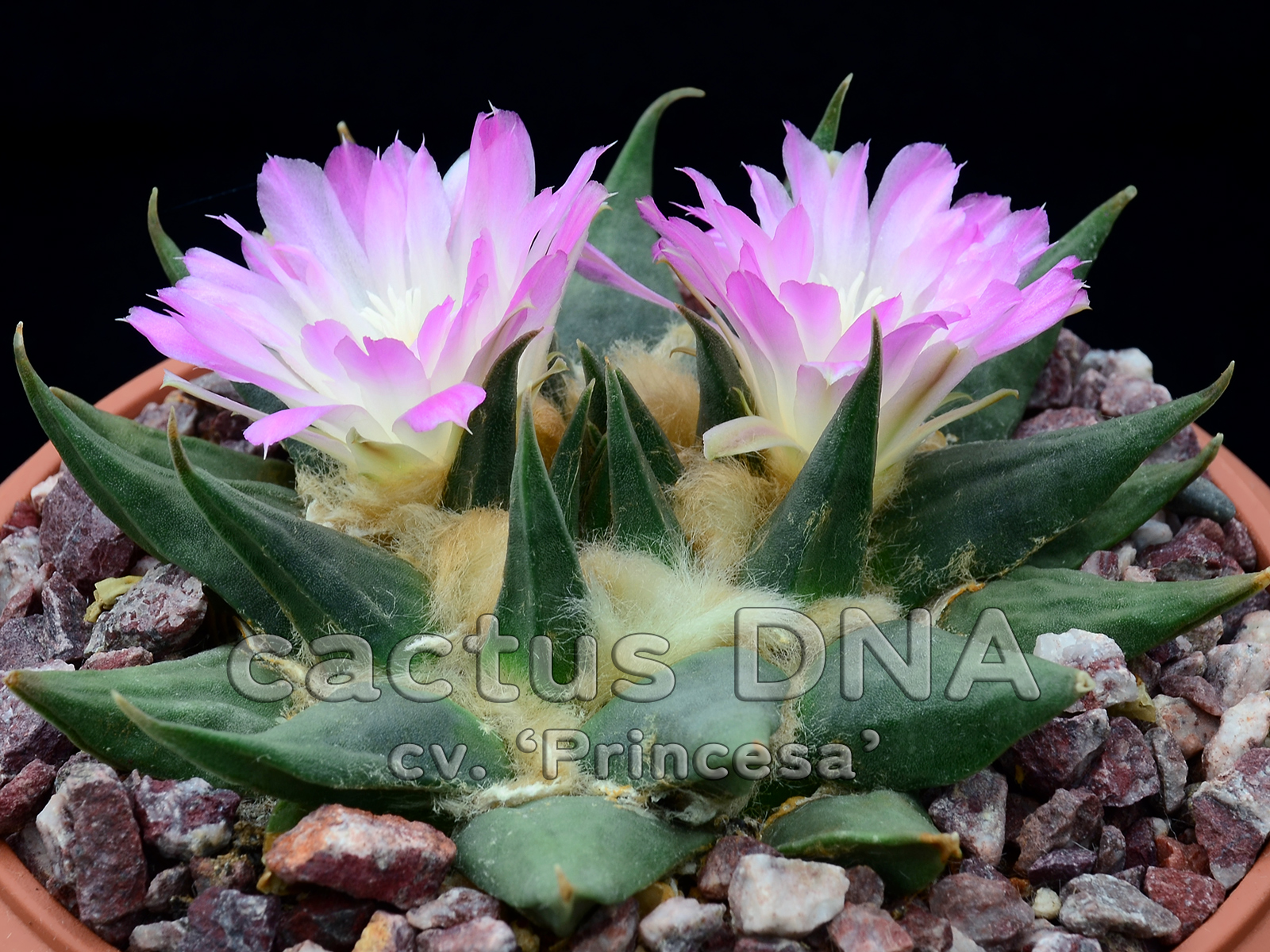 A lovely cultivar we bred and stabilized for impressive abundant flowering of bright pink flowers. Large growing plants with wispy, long, triangular tubercles tapering to a sharp upward pointing tip, alluding to ‘elongatus’ morphology. Originally selected from seedlings in a variable German stock, named as A. trigonus ‘Red Flower’, which was rather misleading, some A. confusus influence is possible. The copious flowers are a lovely translucent pink or to be more accurate, bicolored with pink upper half and creamy-white lower half of the petals. Spectacular!